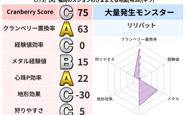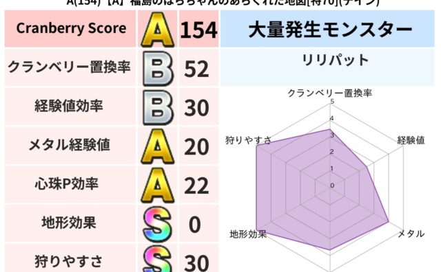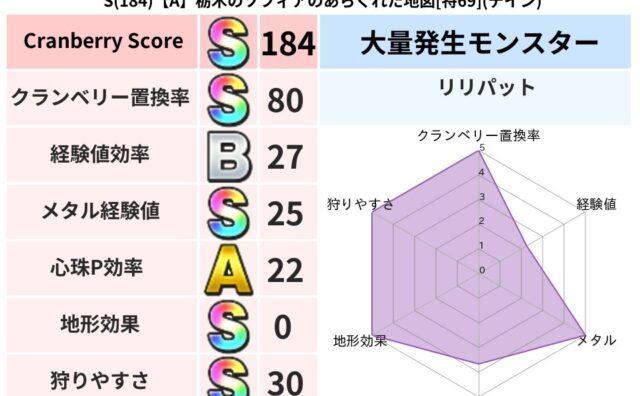 クランベリーボット判定結果の詳細クランベリースコア:204クランベリー置換率:80%大量発生モンスター:リリパットデイン超耐性(0%)こころ道 完全一致モンスターかっちゅうアリ: 魔人(共通Lv1)パペットマン: 天地雷鳴士(天道Lv5)ス...