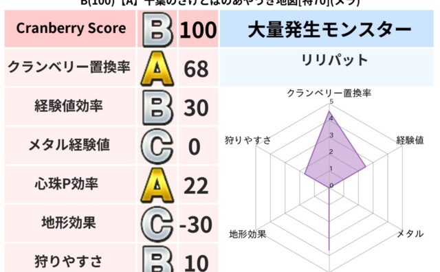 クランベリーボット判定結果の詳細クランベリースコア:149クランベリー置換率:77%大量発生モンスター:リリパット,バアルゼブブデイン超耐性(48%)超耐性・弱耐性なし:バギこころ道 完全一致モンスターヘルボックル: 魔剣士(魔道Lv30)...