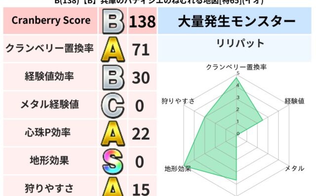クランベリーボット判定結果の詳細クランベリースコア66クランベリー置換率61%大量発生モンスターリリパット,ナスビナーラ超耐性メラ(47%)こころ道 完全一致モンスターキメラ大魔道士(共通Lv1)くさった死体ゴッドハンド(守護道Lv5)大魔...