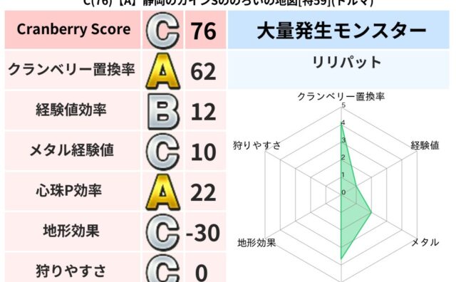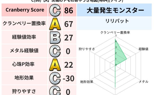 クランベリーボット判定結果の詳細クランベリースコア155クランベリー置換率52%大量発生モンスターリリパット超耐性ドルマ(0%)超耐性・弱耐性なしバギデイン系統狩りけもの系43%こころ道 完全一致モンスタースカルガルードラゴン(竜道Lv5)...