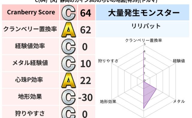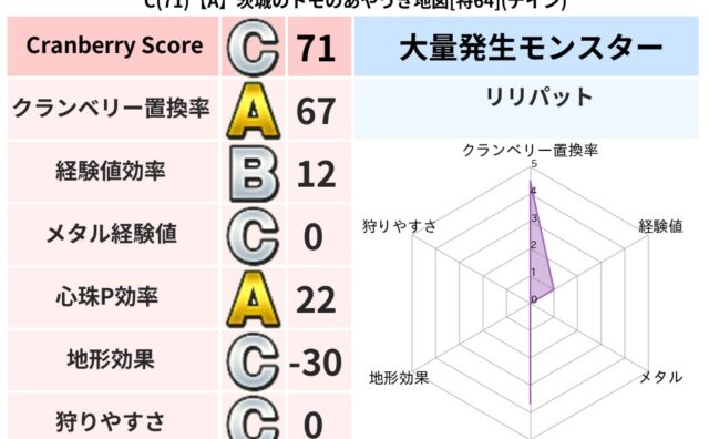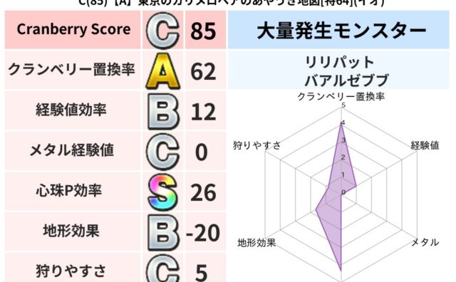 クランベリーボット判定結果の詳細クランベリースコア:125クランベリー置換率:62%大量発生モンスター:リリパットイオ超耐性(0%)こころ道 完全一致モンスターどくイモムシ: ニンジャ(波道Lv5)ヘルボックル: 魔剣士(魔道Lv30)ギズ...