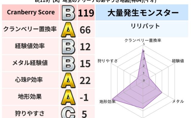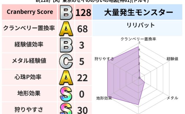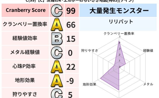 クランベリーボット判定結果の詳細クランベリースコア:115クランベリー置換率:62%大量発生モンスター:リリパット,バアルゼブブイオ超耐性(0%)こころ道 完全一致モンスターくさった死体: ゴッドハンド(守護道Lv5),大魔導士(魔力道Lv...
