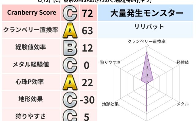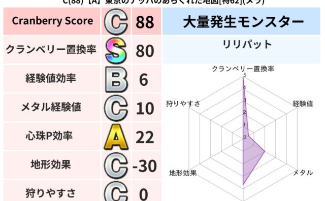 クランベリーボット判定結果の詳細クランベリースコア:128クランベリー置換率:80%大量発生モンスター:リリパットメラ超耐性(0%)系統狩り(45%)こころ道 完全一致モンスターデビルアーマー: 大神官(舞道Lv5)ストーンマン: ゴッドハ...
