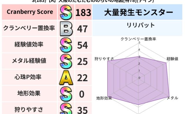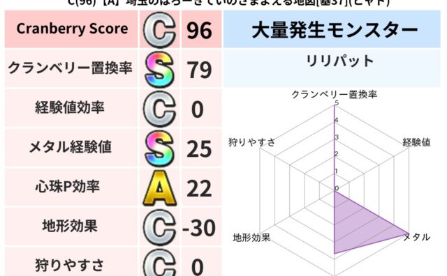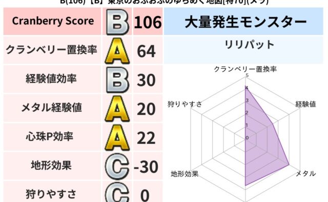 クランベリーボット判定結果の詳細クランベリースコア137クランベリー置換率43%大量発生モンスターリリパット超耐性ギラ(11%)こころ道 完全一致モンスターくさった死体ゴッドハンド(守護道Lv5)大魔道士(魔力道Lv5)ばくだん岩大神官(舞...