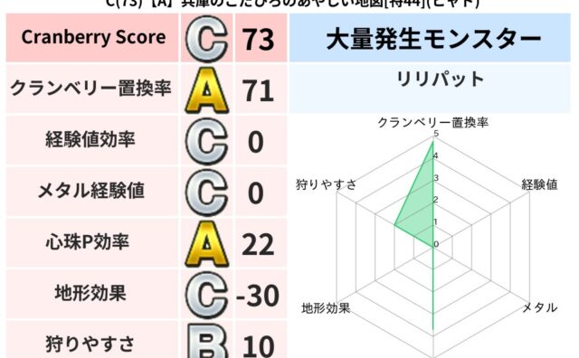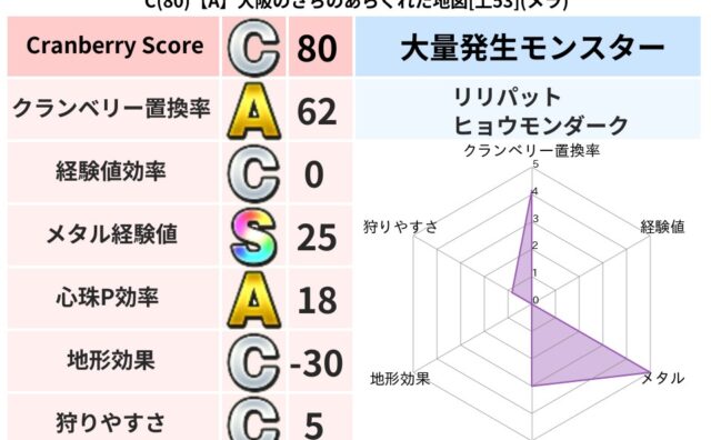 クランベリーボット判定結果の詳細クランベリースコア84クランベリー置換率67%大量発生モンスターリリパット超耐性ギラ(39%)こころ道 完全一致モンスターてつのさそりゴッドハンド(守護道Lv5)大魔道士(魔力道Lv5)キースドラゴン大魔道士...