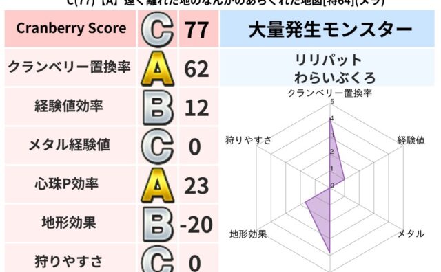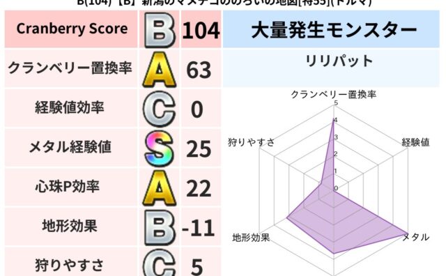 クランベリーボット判定結果の詳細クランベリースコア77クランベリー置換率62%大量発生モンスターリリパット,わらいぶくろ超耐性メラ(17%)こころ道 完全一致モンスタードロヌーバニンジャ(波道Lv5)ミニデーモン大魔道士(魔力道Lv10)デ...