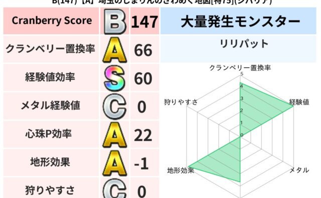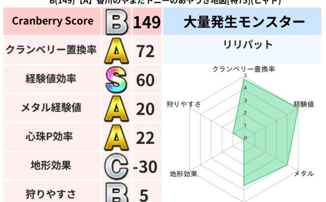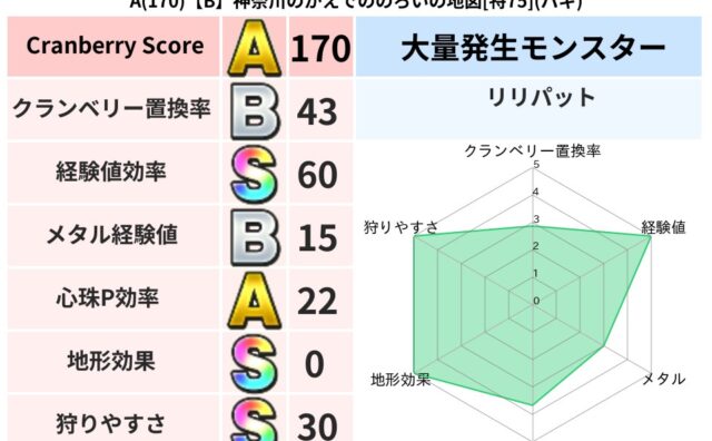 クランベリーボット判定結果の詳細クランベリースコア:142クランベリー置換率:52%大量発生モンスター:リリパットイオ超耐性(10%)こころ道 完全一致モンスターヘルボックル: 魔剣士(魔道Lv30)ばくだん岩: 大神官(舞道Lv5)デンタ...