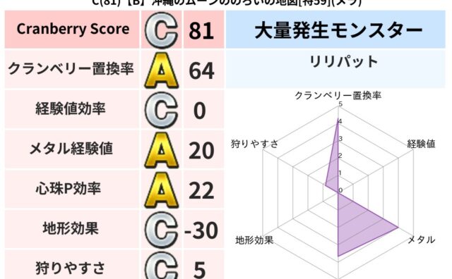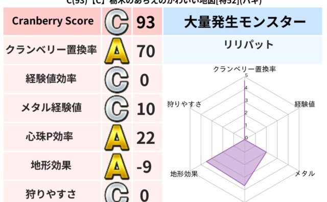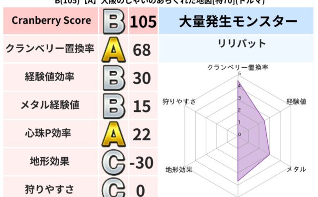 クランベリーボット判定結果の詳細クランベリースコア93クランベリー置換率70%大量発生モンスターリリパット超耐性バギ(7%)系統狩り怪人系41%こころ道 完全一致モンスターどくろあらいゴッドハンド(守護道Lv5)どれいへいしドラゴン(人道L...