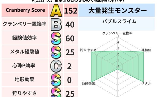 クランベリーボット判定結果の詳細クランベリースコア:143クランベリー置換率:36%大量発生モンスター:バブルスライムバギ超耐性(0%)超耐性・弱耐性なし:デインこころ道 完全一致モンスターかっちゅうアリ: 魔人(共通Lv1)バブルスライム...