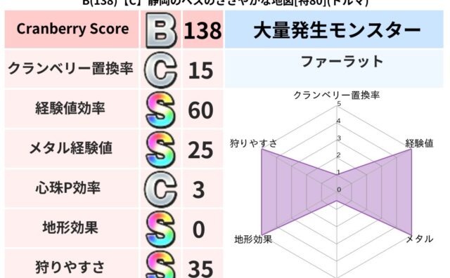 クランベリーボット判定結果の詳細クランベリースコア138クランベリー置換率15%大量発生モンスターファーラット超耐性ドルマ(0%)超耐性・弱耐性なしバギこころ道 完全一致モンスターみならいあくまニンジャ(風道Lv5)フロストギズモ魔剣士(魔...