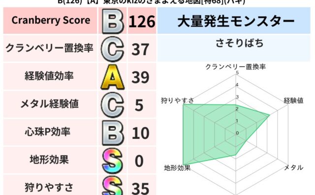 地図判定結果 B(126)【A】東京のkizのさまよえる地図[特68](バギ) クランベリーボット判定結果の詳細クランベリースコア:126クランベリー置換率:37%大量発生モンスター:さそりばちバギ超耐性(0%)超耐性・弱耐性なし:メラ,ギラ,イオ系統狩り(54%)こころ道 完全一致モンスターどくどくゾンビ: 魔剣士(... 2025/09/05 23:07 地図判定結果