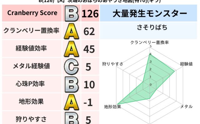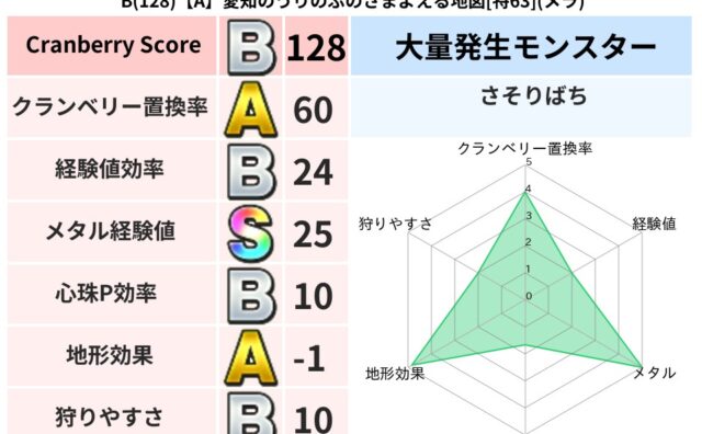 地図判定結果 B(128)【A】愛知のうりのぶのさまよえる地図[特63](メラ) クランベリーボット判定結果の詳細クランベリースコア:128クランベリー置換率:60%大量発生モンスター:さそりばちメラ超耐性(1%)超耐性・弱耐性なし:バギ,ドルマこころ道 完全一致モンスターキャットフライニンジャ(共通Lv1)ドロヌーバニ... 2025/09/05 11:45 地図判定結果
