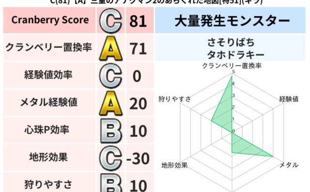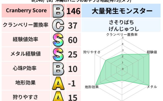 地図判定結果 C(81)【A】三重のアナグマン2のあらくれた地図[特51](ギラ) クランベリーボット判定結果の詳細クランベリースコア:81クランベリー置換率:71%大量発生モンスター:さそりばち,タホドラキーギラ超耐性(52%)超耐性・弱耐性なし:ヒャド,バギこころ道 完全一致モンスターかっちゅうアリ魔人(共通Lv1)ブ... 2025/09/29 13:18 地図判定結果