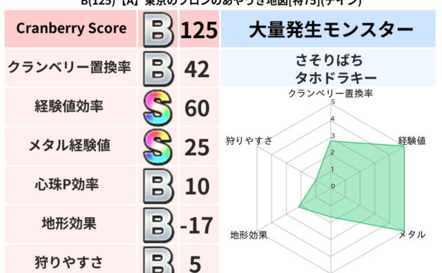 地図判定結果 B(125)【A】東京のフロンのあやうき地図[特75](デイン) クランベリーボット判定結果の詳細クランベリースコア125クランベリー置換率42%大量発生モンスターさそりばち,タホドラキー超耐性デイン(14%)超耐性・弱耐性なしバギこころ道 完全一致モンスターキメラ大魔道士(共通Lv1)ばくだん岩大神官(... 2025/10/15 11:49 地図判定結果
