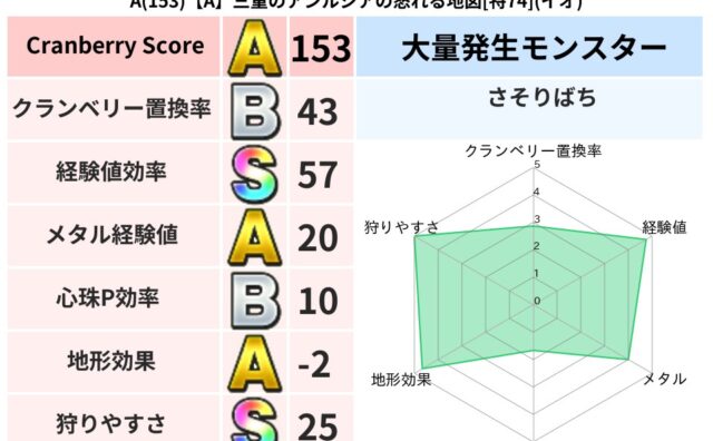 スコアA A(153)【A】三重のアンルシアの怒れる地図[特74](イオ) クランベリーボット判定結果の詳細クランベリースコア153クランベリー置換率43%大量発生モンスターさそりばち超耐性イオ(1%)超耐性・弱耐性なしバギデインドルマ系統狩り怪人系53%こころ道 完全一致モンスターがいこつ魔剣士(共通Lv1)ブラ... 2025/08/27 16:40 スコアA地図判定結果
