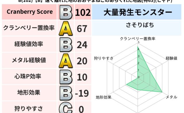 クランベリーボット判定結果の詳細クランベリースコア69クランベリー置換率64%大量発生モンスターさそりばち超耐性バギ(46%)超耐性・弱耐性なしデインこころ道 完全一致モンスターどれいへいしドラゴン(人道Lv5)かっちゅうアリ魔人(共通Lv...