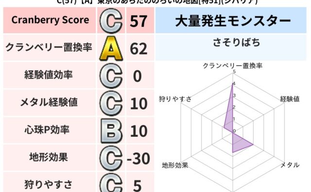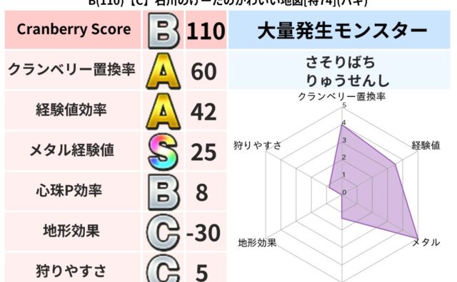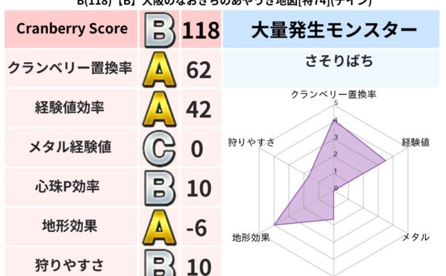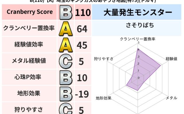 クランベリーボット判定結果の詳細クランベリースコア118クランベリー置換率62%大量発生モンスターさそりばち超耐性デイン(5%)超耐性・弱耐性なしバギ系統狩り虫系54%こころ道 完全一致モンスターかっちゅうアリ魔人(共通Lv1)しのどれいゴ...