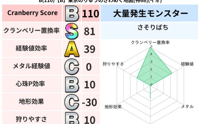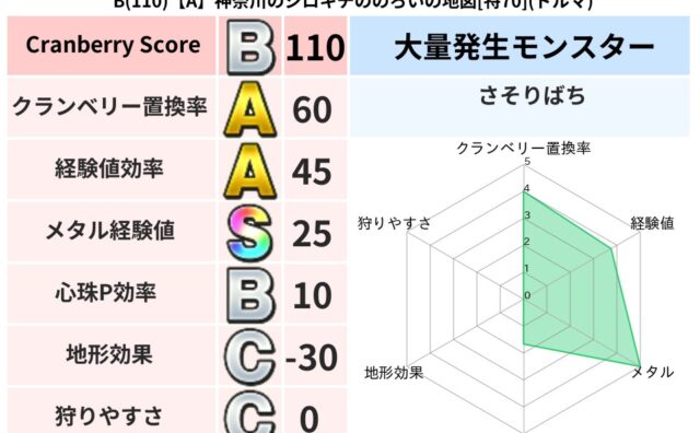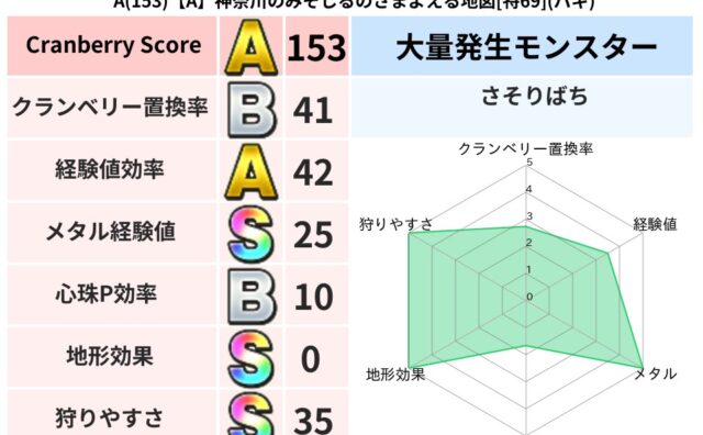クランベリーボット判定結果の詳細クランベリースコア:78クランベリー置換率:60%大量発生モンスター:さそりばち,じごくのもんばんバギ超耐性(75%)こころ道 完全一致モンスターキャットフライニンジャ(共通Lv1)ナイトキャット守り人(まも...