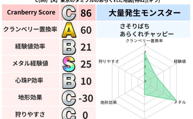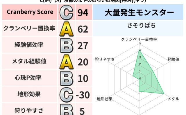 クランベリーボット判定結果の詳細クランベリースコア95クランベリー置換率60%大量発生モンスターさそりばち超耐性ドルマ(52%)こころ道 完全一致モンスターベロニャーゴ大魔道士(理力道Lv5)キースドラゴン大魔道士(理力道Lv5)さそりばち...