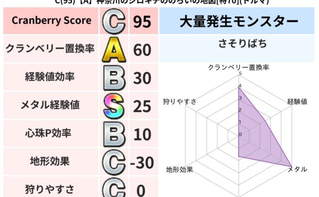 クランベリーボット判定結果の詳細クランベリースコア153クランベリー置換率41%大量発生モンスターさそりばち超耐性バギ(0%)超耐性・弱耐性なしデイン系統狩りゾンビ系41%こころ道 完全一致モンスターしのどれいゴッドハンド(守護道Lv5)大...