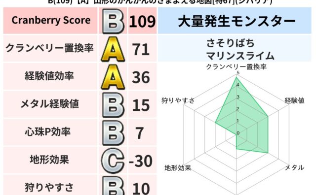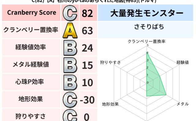 クランベリーボット判定結果の詳細クランベリースコア82クランベリー置換率63%大量発生モンスターさそりばち超耐性ドルマ(46%)こころ道 完全一致モンスターベロニャーゴ大魔道士(理力道Lv5)かっちゅうアリ魔人(共通Lv1)さそりばちニンジ...