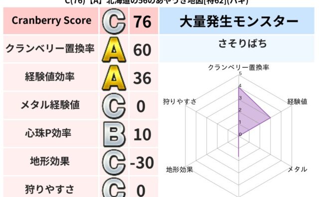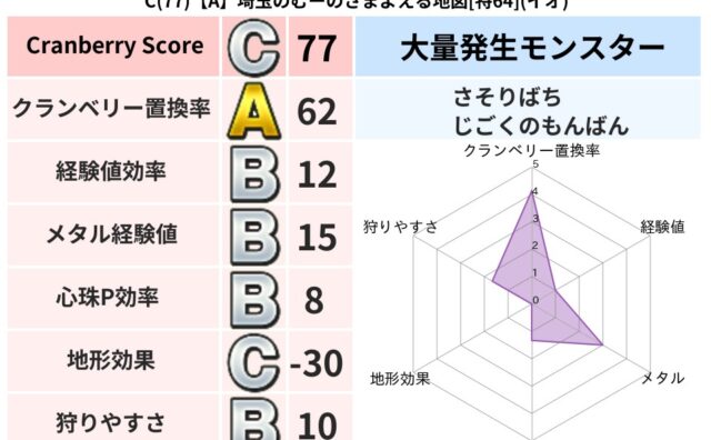 クランベリーボット判定結果の詳細クランベリースコア:104クランベリー置換率:64%大量発生モンスター:さそりばちジバリア超耐性(0%)こころ道 完全一致モンスターどれいへいし: ドラゴン(人道Lv5)ヒートギズモ: 守り人(ささえ道Lv5...