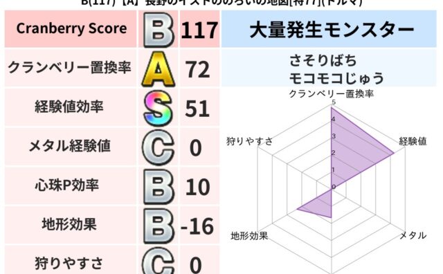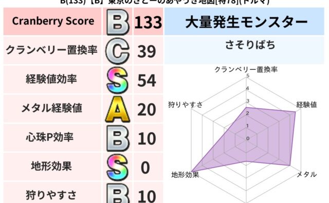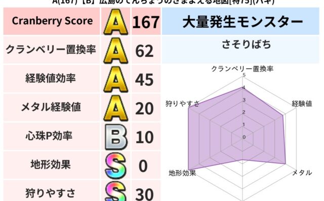 クランベリーボット判定結果の詳細クランベリースコア143クランベリー置換率58%大量発生モンスターさそりばち超耐性バギ(0%)こころ道 完全一致モンスターばくだん岩大神官(舞道Lv5)しりょうのきし大神官(舞道Lv5)ストーンマンゴッドハン...