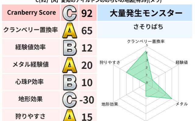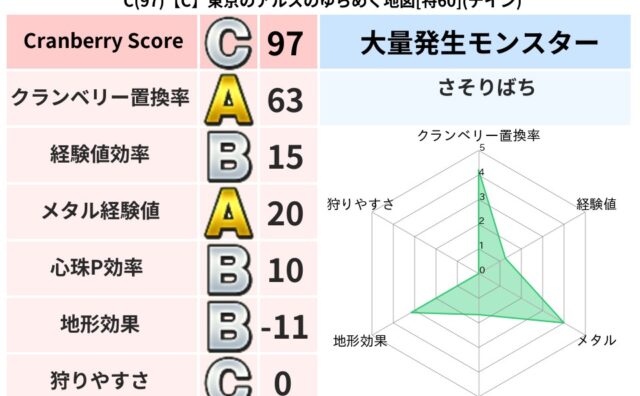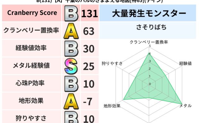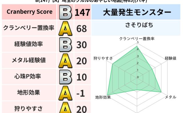 クランベリーボット判定結果の詳細クランベリースコア:97クランベリー置換率:63%大量発生モンスター:さそりばちデイン超耐性(9%)こころ道 完全一致モンスターストーンマンゴッドハンド(守護道Lv5)だいまどうゴッドハンド(武道Lv40)さ...