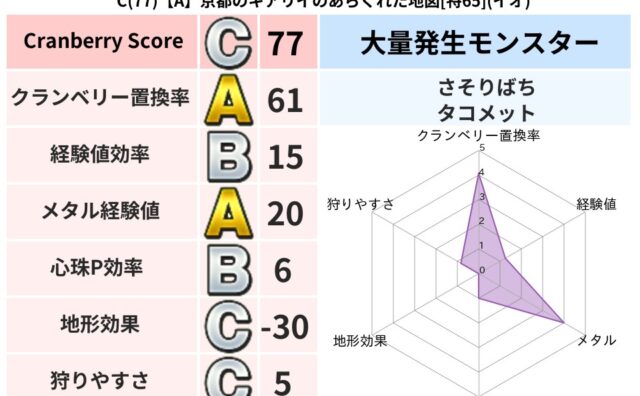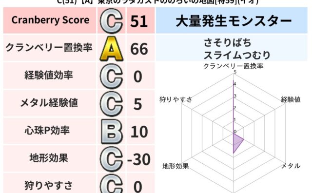 クランベリーボット判定結果の詳細クランベリースコア:102クランベリー置換率:62%大量発生モンスター:さそりばちジバリア超耐性(1%)こころ道 完全一致モンスターキメラ大魔導士(共通Lv1)デビルアーマー大神官(舞道Lv5)グリゴンダンス...