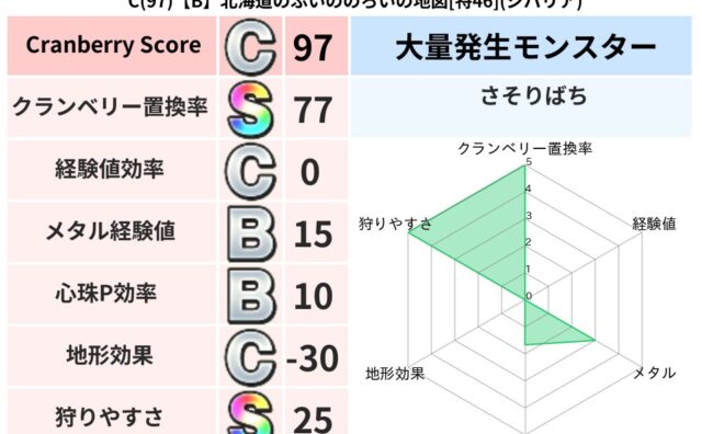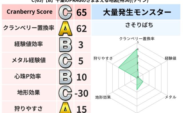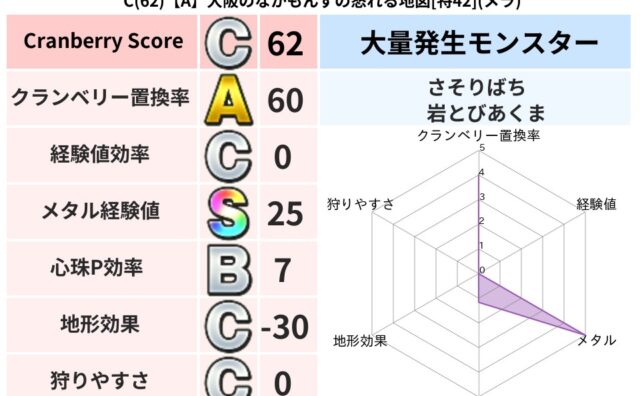 クランベリーボット判定結果の詳細クランベリースコア:80クランベリー置換率:62%大量発生モンスター:さそりばちデイン超耐性(0%)系統狩り(40%)こころ道 完全一致モンスターストーンマン: ゴッドハンド(守護道Lv5)リカントマムル: ...