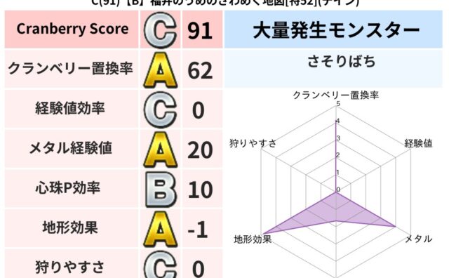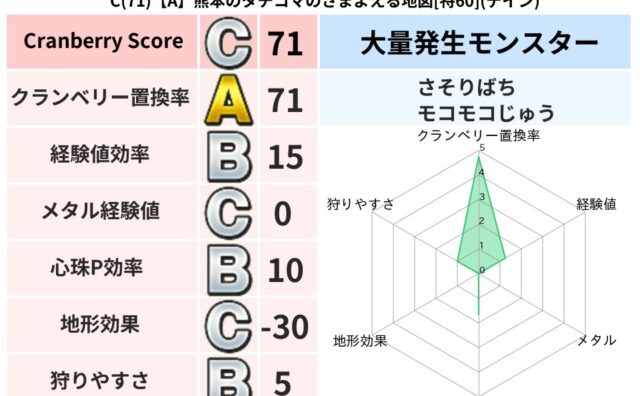 クランベリーボット判定結果の詳細クランベリースコア:96クランベリー置換率:71%大量発生モンスター:さそりばち,モコモコじゅうデイン超耐性(0%)こころ道 完全一致モンスターねこまどう: ニンジャ(風道Lv5)しのどれい: ゴッドハンド(...