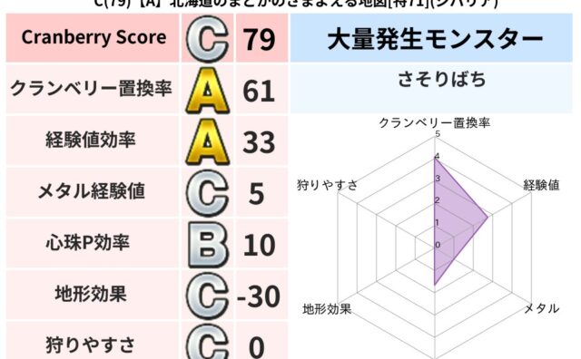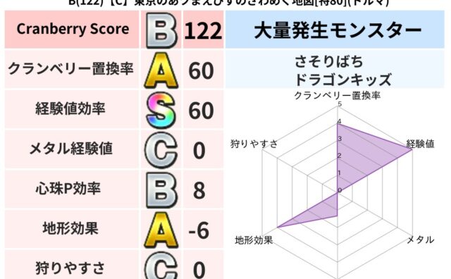 クランベリーボット判定結果の詳細クランベリースコア133クランベリー置換率39%大量発生モンスターさそりばち超耐性ドルマ(0%)こころ道 完全一致モンスターしのどれいゴッドハンド(守護道Lv5)大魔道士(魔力道Lv5)ばくだん岩大神官(舞道...