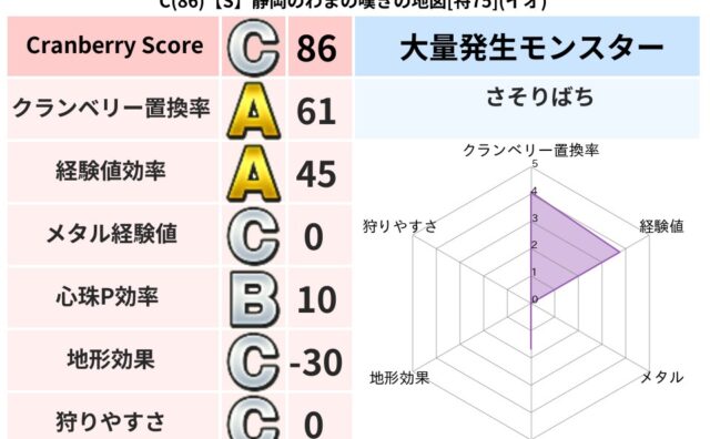 クランベリーボット判定結果の詳細クランベリースコア131クランベリー置換率58%大量発生モンスターさそりばち,じごくのもんばん超耐性デイン(30%)超耐性・弱耐性なしバギドルマこころ道 完全一致モンスターギズモ天地雷鳴士(共通Lv1)ブラウ...