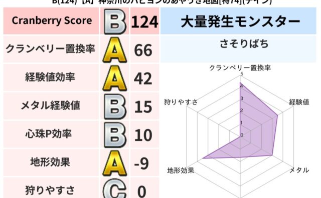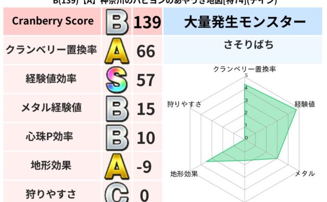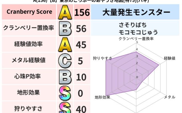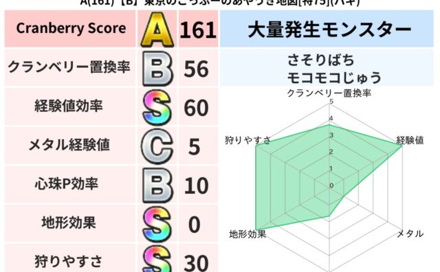 クランベリーボット判定結果の詳細クランベリースコア:102クランベリー置換率:61%大量発生モンスター:さそりばちイオ超耐性(72%)こころ道 完全一致モンスターキャットフライニンジャ(共通Lv1)かっちゅうアリ魔人(共通Lv1)グリゴンダ...