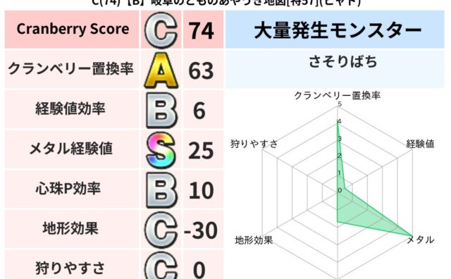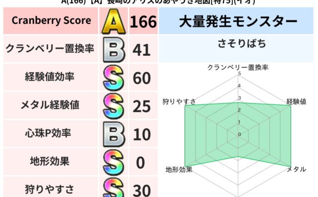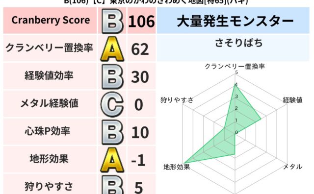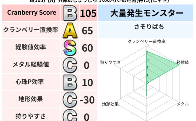 クランベリーボット判定結果の詳細クランベリースコア91クランベリー置換率62%大量発生モンスターさそりばち超耐性バギ(0%)超耐性・弱耐性なしデインこころ道 完全一致モンスターどくろあらいゴッドハンド(守護道Lv5)さそりばちニンジャ(波道...