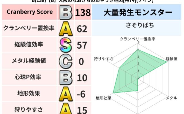 クランベリーボット判定結果の詳細クランベリースコア:133クランベリー置換率:59%大量発生モンスター:さそりばちバギ超耐性(9%)こころ道 完全一致モンスターベロニャーゴ: 大魔導士(理力道Lv5)かっちゅうアリ: 魔人(共通Lv1)つか...