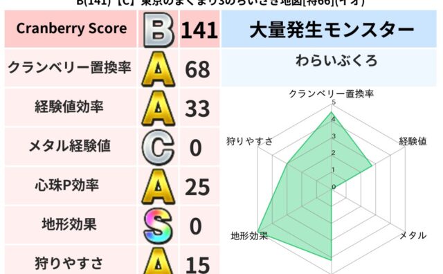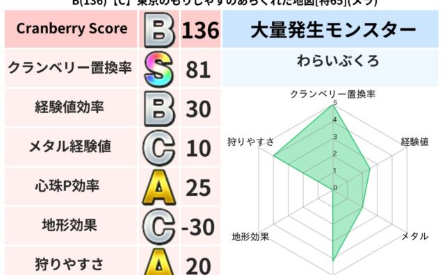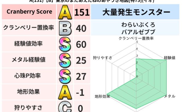 クランベリーボット判定結果の詳細クランベリースコア:133クランベリー置換率:51%大量発生モンスター:わらいぶくろドルマ超耐性(11%)こころ道 完全一致モンスターてっこうまじん: 大神官(舞道Lv10)ドロルメイジ: 大魔導士(魔力道L...