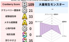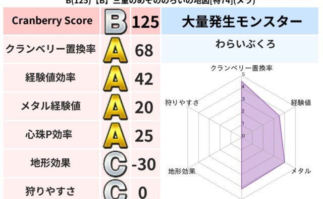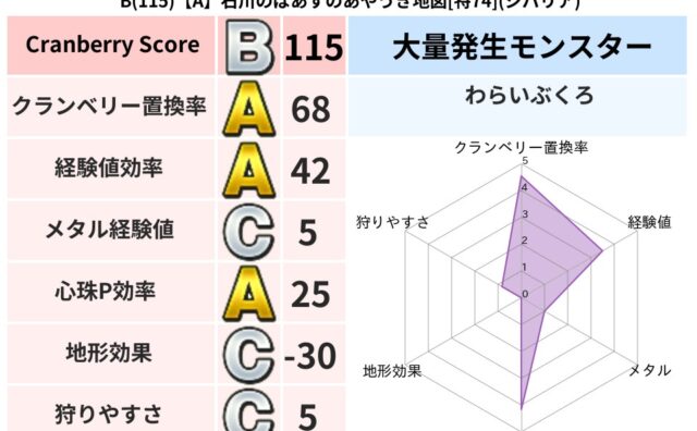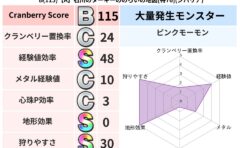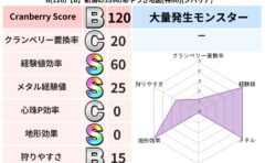 クランベリーボット判定結果の詳細クランベリースコア:130クランベリー置換率:68%大量発生モンスター:わらいぶくろジバリア超耐性(69%)超耐性・弱耐性なし:デインこころ道 完全一致モンスターフレイム守り人(ささえ道Lv5)ベビーサラマン...