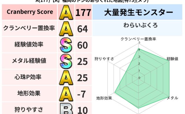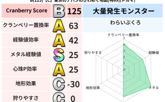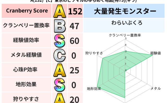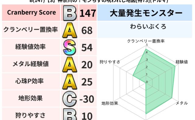 クランベリーボット判定結果の詳細クランベリースコア152クランベリー置換率47%大量発生モンスターわらいぶくろ超耐性ギラ(0%)超耐性・弱耐性なしデインドルマこころ道 完全一致モンスターキャットフライニンジャ(共通Lv1)ひとくいばこ魔剣士...