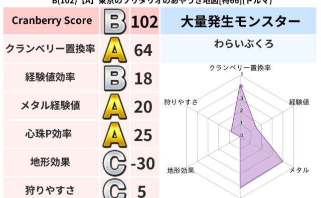 クランベリーボット判定結果の詳細クランベリースコア102クランベリー置換率64%大量発生モンスターわらいぶくろ超耐性ドルマ(74%)超耐性・弱耐性なしバギこころ道 完全一致モンスターベロニャーゴ大魔道士(理力道Lv5)どれいへいしドラゴン(...