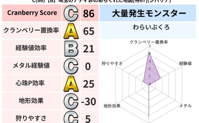 クランベリーボット判定結果の詳細クランベリースコア125クランベリー置換率65%大量発生モンスターわらいぶくろ超耐性デイン(38%)超耐性・弱耐性なしイオこころ道 完全一致モンスターデビルアーマー大神官(舞道Lv5)しりょうのきし大神官(舞...