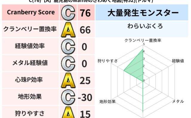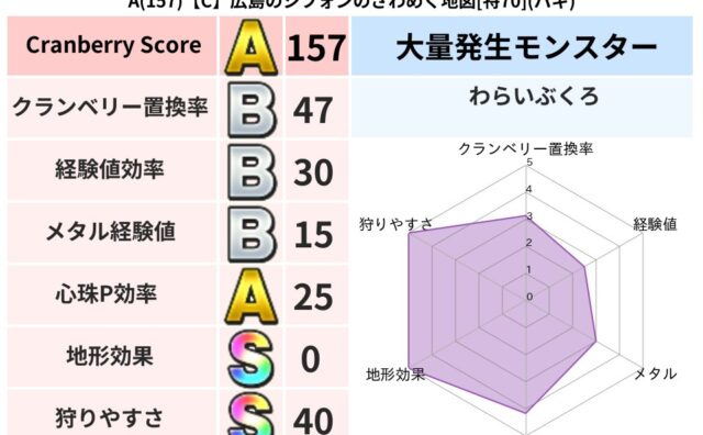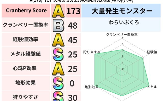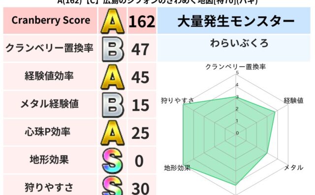 クランベリーボット判定結果の詳細クランベリースコア:188クランベリー置換率:48%大量発生モンスター:わらいぶくろバギ超耐性(0%)超耐性・弱耐性なし:メラ,デインこころ道 完全一致モンスターキャットフライ: ニンジャ(共通Lv1)どくイ...