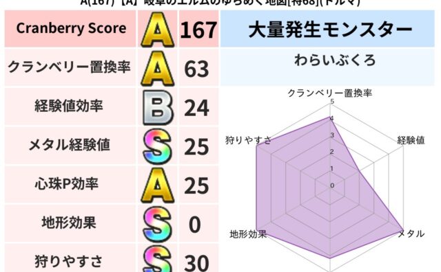 クランベリーボット判定結果の詳細クランベリースコア:136クランベリー置換率:68%大量発生モンスター:わらいぶくろドルマ超耐性(46%)超耐性・弱耐性なし:バギ系統狩り(43%)こころ道 完全一致モンスターパペットマン天地雷鳴士(天道Lv...