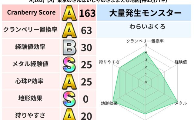 クランベリーボット判定結果の詳細クランベリースコア:145クランベリー置換率:65%大量発生モンスター:わらいぶくろイオ超耐性(6%)こころ道 完全一致モンスターブラウニー: 守り人(共通Lv1)ブリザード: ニンジャ(風道Lv10)ブラッ...