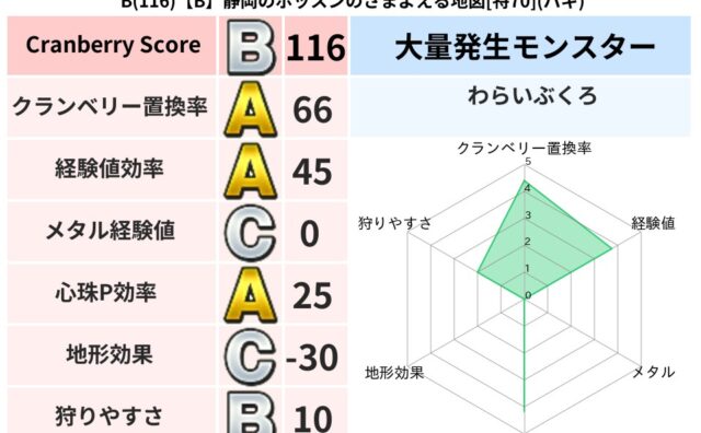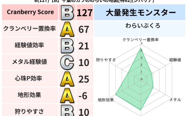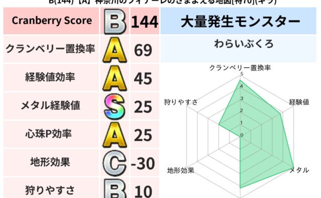 クランベリーボット判定結果の詳細クランベリースコア129クランベリー置換率69%大量発生モンスターわらいぶくろ超耐性ギラ(88%)超耐性・弱耐性なしイオバギこころ道 完全一致モンスターストーンマンゴッドハンド(守護道Lv5)つかいま大魔道士...