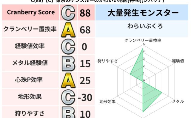 クランベリーボット判定結果の詳細クランベリースコア125クランベリー置換率62%大量発生モンスターリリパット,わらいぶくろ超耐性ドルマ(0%)超耐性・弱耐性なしヒャドバギジバリアこころ道 完全一致モンスターねこまどうニンジャ(風道Lv5)ブ...