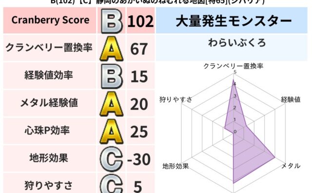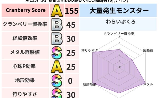 クランベリーボット判定結果の詳細クランベリースコア164クランベリー置換率49%大量発生モンスターわらいぶくろ超耐性ドルマ(0%)こころ道 完全一致モンスタードロヌーバニンジャ(波道Lv5)アッシュリザードニンジャ(波道Lv70)ミニデーモ...