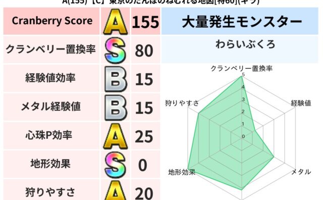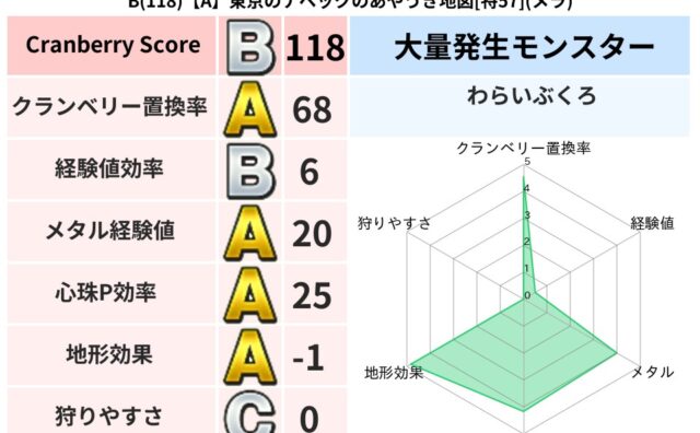 クランベリーボット判定結果の詳細クランベリースコア136クランベリー置換率66%大量発生モンスターわらいぶくろ超耐性ヒャド(0%)系統狩り物質系40%こころ道 完全一致モンスターフレイム守り人(ささえ道Lv5)キースドラゴン大魔道士(理力道...