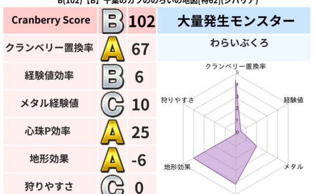 クランベリーボット判定結果の詳細クランベリースコア102クランベリー置換率67%大量発生モンスターわらいぶくろ超耐性ジバリア(5%)系統狩り物質系42%こころ道 完全一致モンスターどくイモムシニンジャ(波道Lv5)ベロニャーゴ大魔道士(理力...
