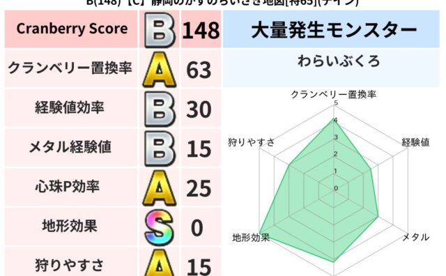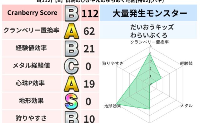クランベリーボット判定結果の詳細クランベリースコア150クランベリー置換率65%大量発生モンスターわらいぶくろ超耐性イオ(0%)系統狩り物質系53%こころ道 完全一致モンスターしのどれいゴッドハンド(守護道Lv5)大魔道士(魔力道Lv5)が...